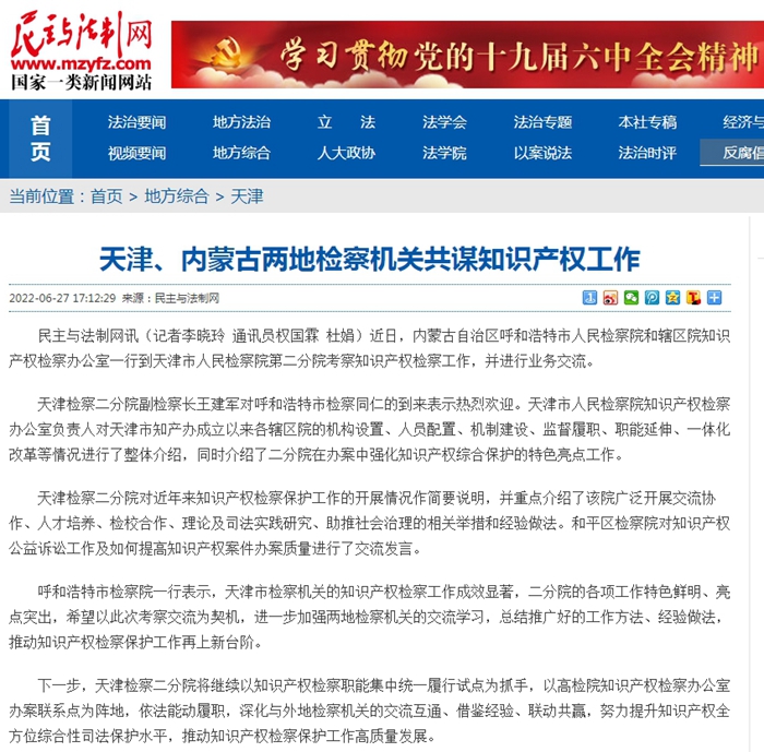 【民主与法制网】天津、内蒙古两地检察机关共谋知识产权工作