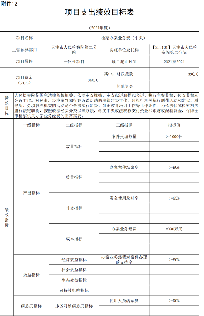 天津市人民检察院2021年检察办案业务费(中央)项目支出绩效目标表