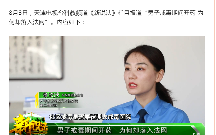 天津电视台科教频道《新说法》栏目2022年8月3日报道我院“男子戒毒期间开药 为何却落入法网”