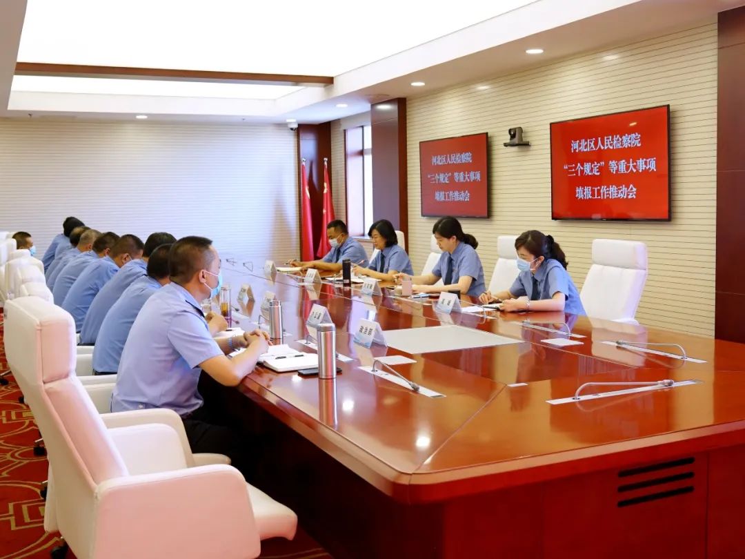 按照高检院、市院要求,结合我院“三个规定”等重大事项填报工作的情况,6月23日下午,我院召开河北区人民检察院“三个规定”等重大事项填报工作推动会。会上,综合业务部负责人通报了天津市人民检察院4月份及我院5月份执行“三个规定”等重大事项记录报告制度情况并对“三个规定”等重大事项填报问题进行专题培训。院党组副书记、副检察长刘家卿传达了《张军检察长关于执行“三个规定”及重大事项记录报告制度的指示批示》。党组书记、检察长王瑞娟对我院“三个规定”等重大事项记录报告工作提出要求。