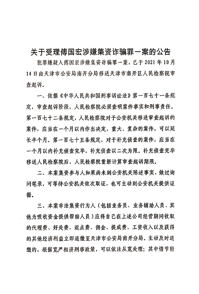 关于受理傅国宏涉嫌集资诈骗罪一案的公告